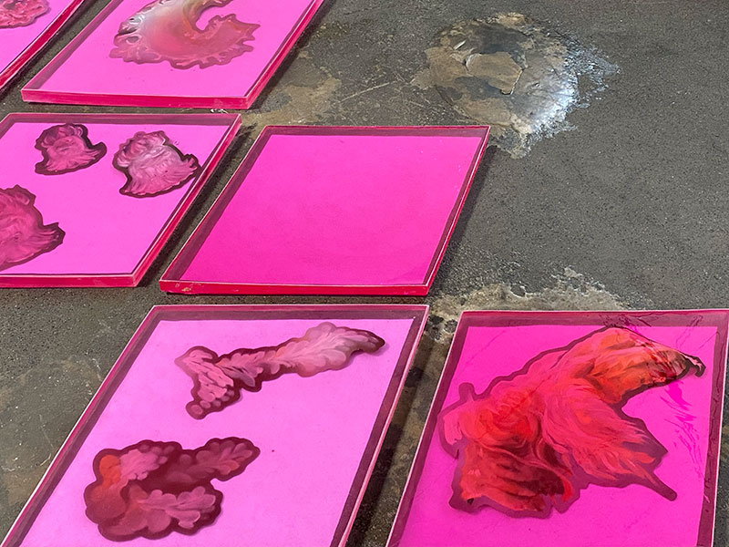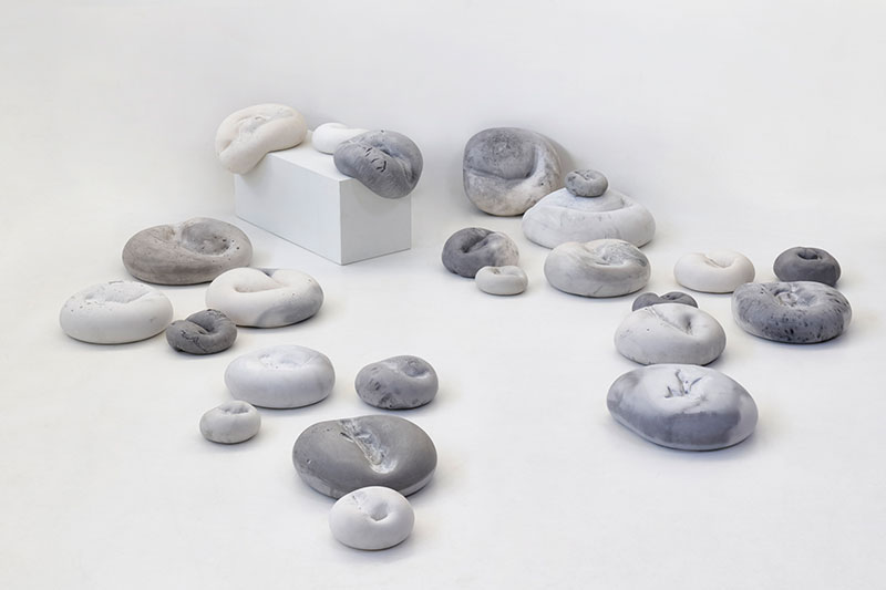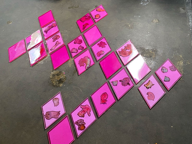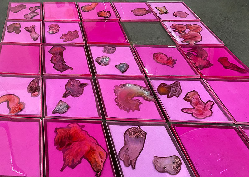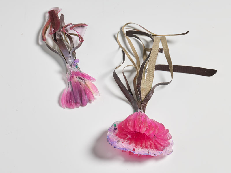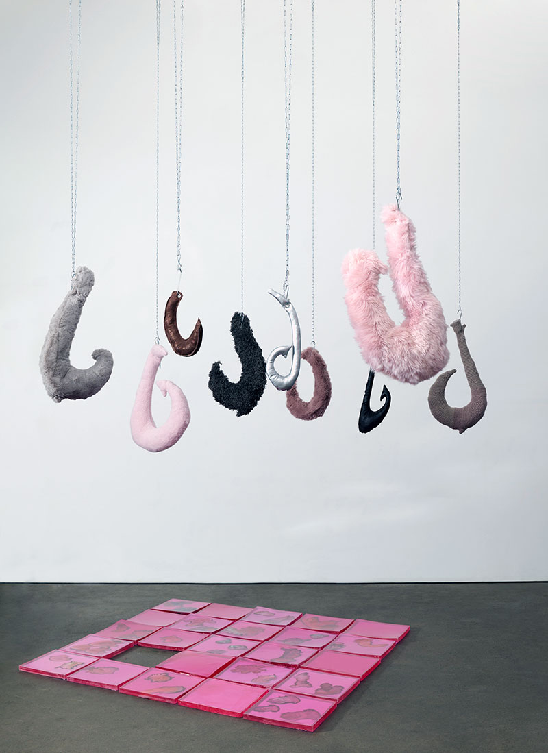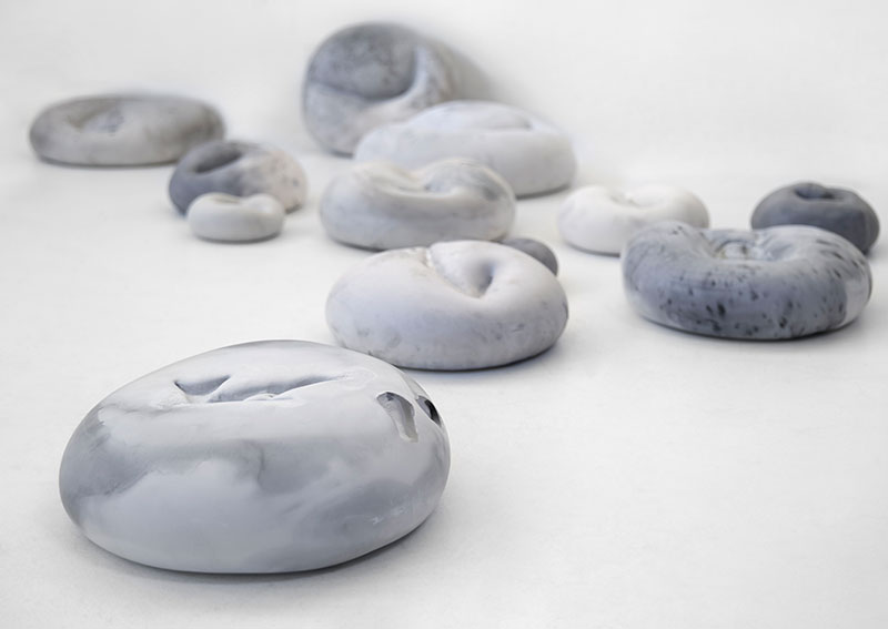 Be der Arbeitsreihe „happy hunting grounds 2.0“ handelt sich um eine erweiterte Übersetzung der Malereiserie „happy hunting grounds“ in eine Rauminstallation. Sie besteht aus: „interior hooks“,„double conservation“, „fossil finds“ und neuerdings "mutants".Material: interior hooks: unterschiedliche Textilien, je Haken von 32 cm bis 98 cm | double conservation: Öl auf Leinwand in Epoxidharz, Seitenlänge je Element: 45 cm | fossil finds: Gips, je Element Ø 28 cm | mutants Öl auf Leinwand mit Epoxidharz von 18 cm bis 51 cm