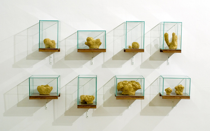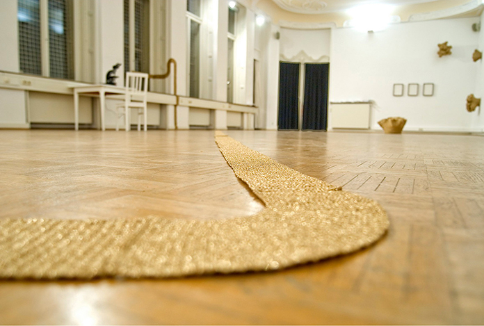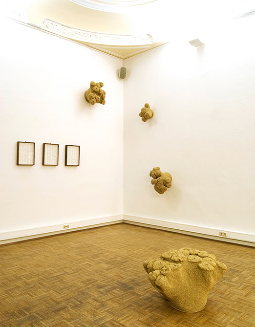 „In medizinischer aber vor allem in philosophischer Hinsicht erleben wir dank dieser Entdeckung eine Sensation. Eine biochemische Symbiose zwischen Mensch und Tier, die massiven Einfluss auf die menschliche Emotion hat und möglicherweise schon immer hatte.“Material: hauptsächlich Häkelarbeiten aus goldenem Lurexgarn