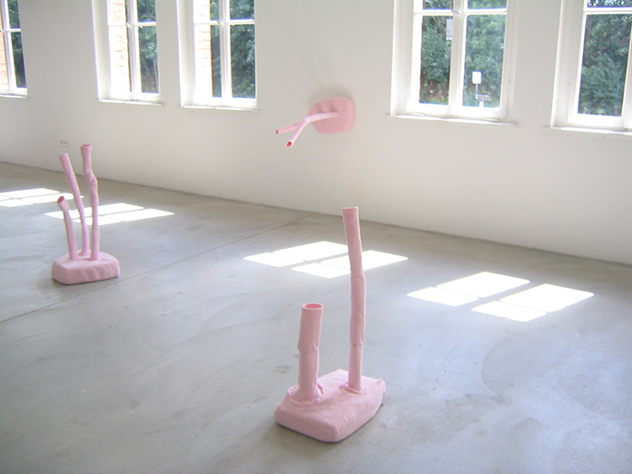 In der Installation „sea-yarn“ sind die von der Unterwasserwelt inspirierten Häkelorgane in einen domestizierten Zusammenhang gestellt, der in erster Linie an die unmittelbar häusliche Umgebung erinnert. In dem installierten Umfeld erstarren die ürsprünglich vitalen Organe zu beinah zweidimensionalen Gebrauchsgegenständen. Die gestrandeten, vollplastischen Häkelwesen „network“ sowie die „pipe-tissues“ verweisen noch auf den Ursprungsort.Material: Häkelarbeiten aus Baumwolle