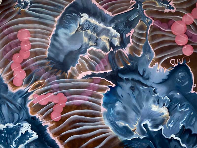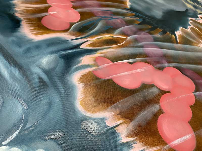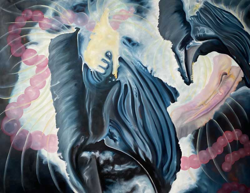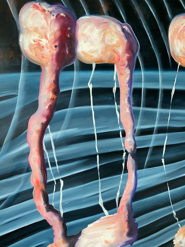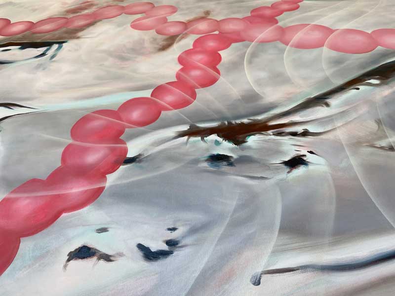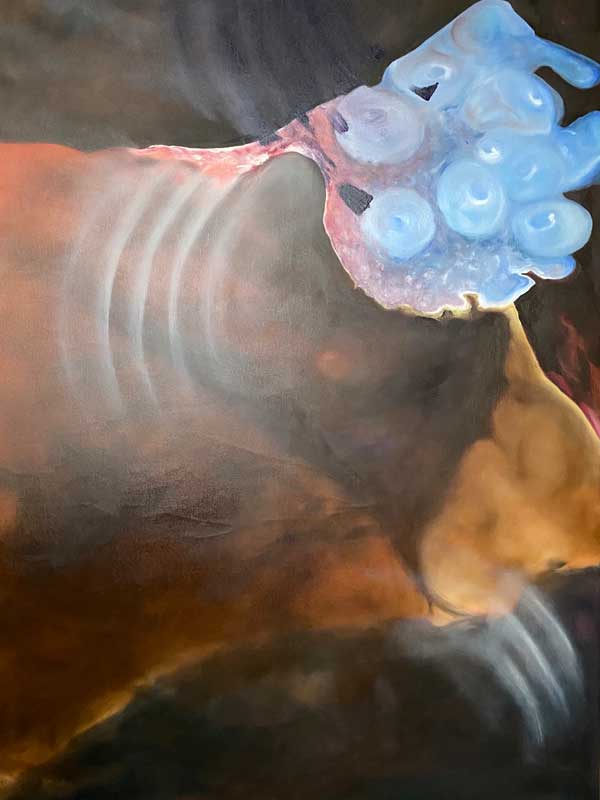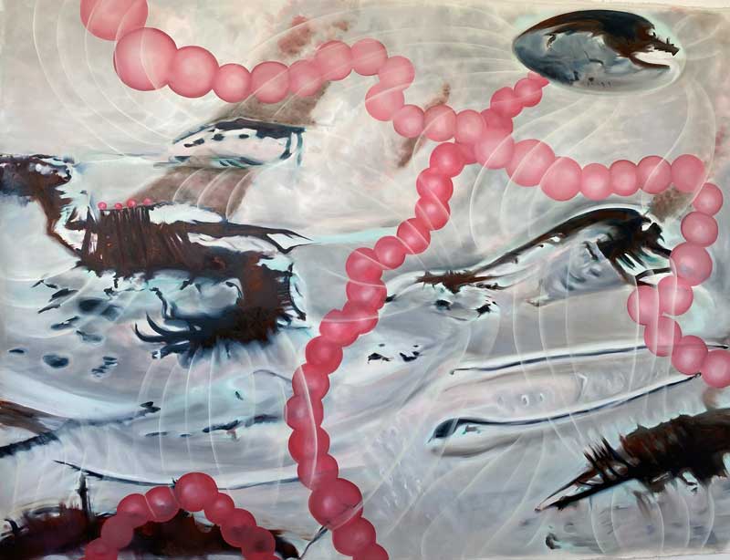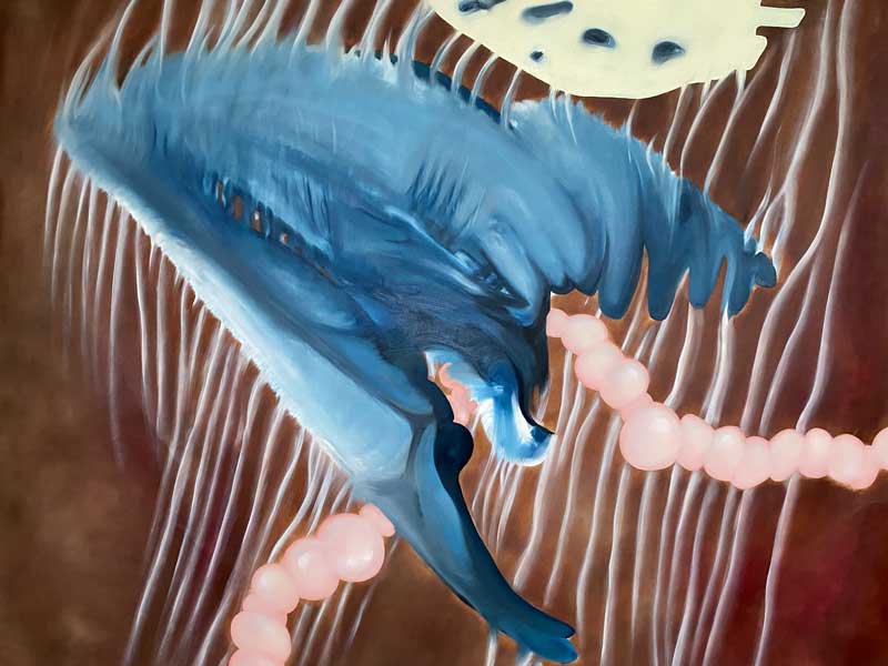 Es geht um die Mannigfaltigkeit entdeckter und noch unentdeckter Lebensformen, um mögliche Zusammenhänge von inneren Vorgängen und Lebendigkeiten im Außen. Wie bei seayarn spielen hier Fragen an die Dimensionen Häuslichkeit und Wildheit eine Rolle. Zudem ist das Aufzeigen der Begrenzung der Vorstellungswelt durch die jeweils prägende Zivilisationsform ein Thema. So viel mehr ist existent als das, worin wir es uns gemütlich gemacht haben. Ein MEHR an Lebensformen genauso wie ein MEHR an Kommunikationsarten und an Gedankengebilden.Material: Öl auf Leinwand