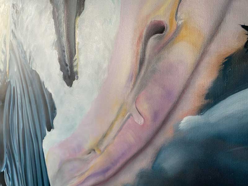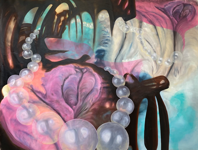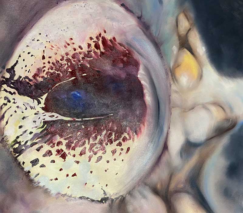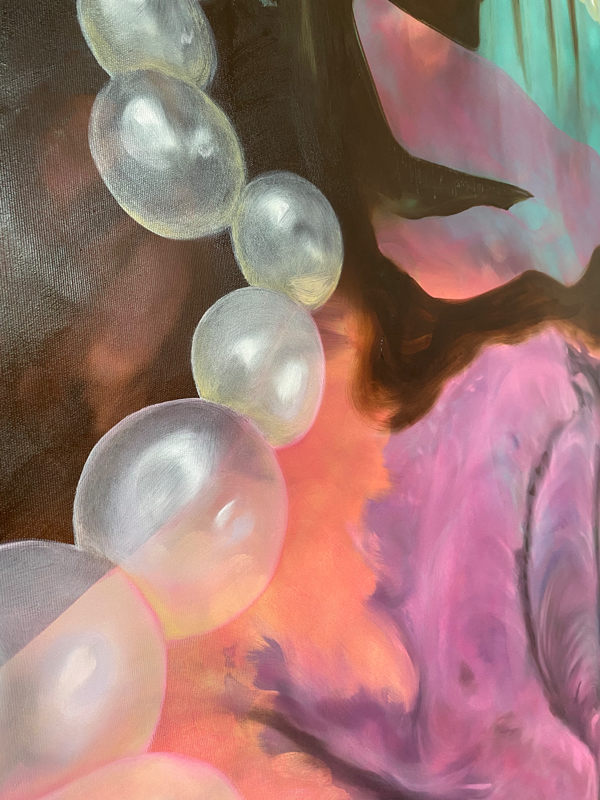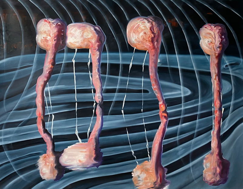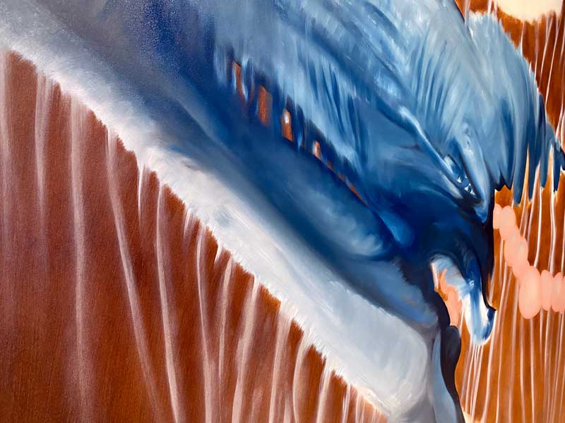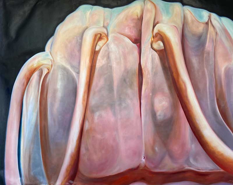 Es geht um die Mannigfaltigkeit entdeckter und noch unentdeckter Lebensformen, um mögliche Zusammenhänge von inneren Vorgängen und Lebendigkeiten im Außen. Wie bei seayarn spielen hier Fragen an die Dimensionen Häuslichkeit und Wildheit eine Rolle. Zudem ist das Aufzeigen der Begrenzung der Vorstellungswelt durch die jeweils prägende Zivilisationsform ein Thema. So viel mehr ist existent als das, worin wir es uns gemütlich gemacht haben. Ein MEHR an Lebensformen genauso wie ein MEHR an Kommunikationsarten und an Gedankengebilden.Material: Öl auf Leinwand